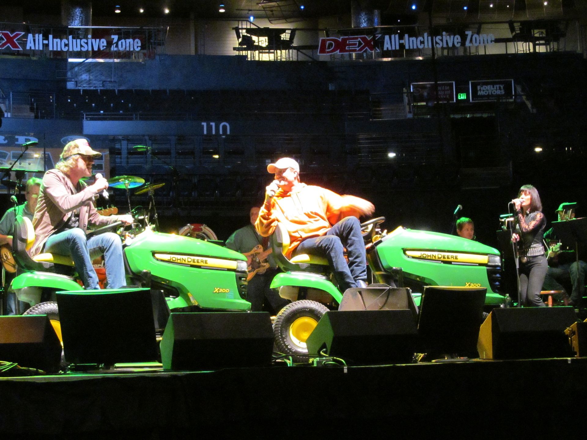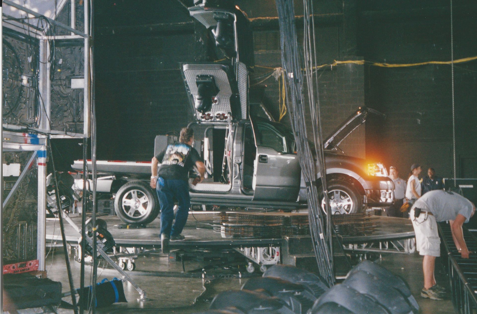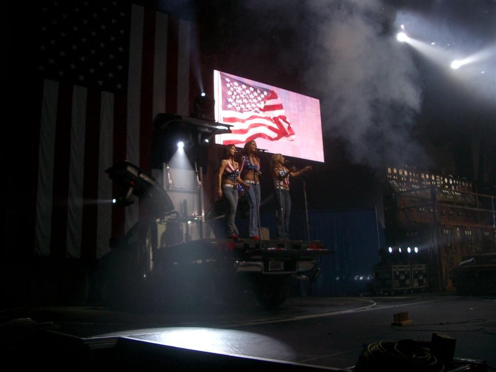 While touring with Toby Keith he would always have a patriotic segment at the end of his shows. It would start with his guitar player playing a solo segment of The Star-Spangled Banner. He would then do his hit songs American Soldier and Angry American. I remember after 911 when Toby came out with Angry American, it wasn’t the sentiment I wanted to hear. I wasn’t a fan of the song. However, it certainly resonated with his fan base. When he went into that song during his concerts, the energy from the audience to the stage could almost bowl you over and it wasn’t directed at me. I’ve never experienced anything like it. Ford trucks sponsored the tour and this truck had been customized to transform into a stage. Toby would be hiding in it and when the show started it would start unfolding and out he would come. After that it became a stage for us T-Backs. We would dance and it would bounce. More than once Mica grabbed hold of me to keep me from flying off as it bounced. L to R, myself, Mica Roberts and Laurin Simmons.