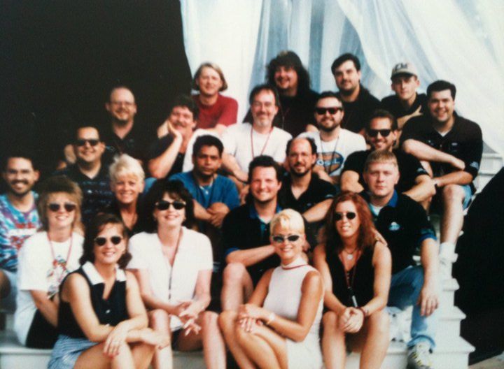 In 1996, Lorrie Morgan did a package show tour sponsored by Kraft. Pam Tillis and Carlene Carter were also on the tour - all were second generation country music artists. Carlene, the daughter of June Carter and Carl Smith, Pam the daughter of Mel Tillis, and Lorrie, the daughter of George Morgan. For this tour, Lorrie increased her production. We are pictured here on the large winding staircase that was part of the set design for the show. Pictured back row L to R: Howard Mayberry (drums,) ?, Pat Lassiter (bass), ?, Row 2: ?, Spud Cottingham (keyboards), David Wood (steel guitar), Noel Roy (lead guitar), Seth Jackson (LD), Row 3, Tony Conway (booking agent), Bird Katwaroo (front of house engineer) Barry Hawkins (stage manager), ?, Row 4: Rob Brownfield (fiddle), Beth Chamberlain (wardrobe), Jeff Hawkins (Production Manager), Chris Ward (production), Row 5: Wendy Hicks (background vocals), Susan Nadler (artist management), Tina (lighting), bottom row: myself and Lorrie.