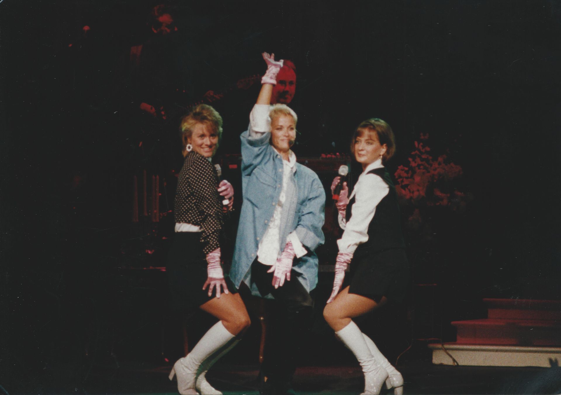I toured with Lorrie Morgan for a total of 11 years, doing 10 consecutive years starting in 1993. I would return for 2005 after the Shock’n Ya’ll tour with Toby. In 1996, Lorrie wanted to add another background vocalist for her Greater Need tour which also included extensive dates sponsored by Kraft where she would appear on the same ticket with Pam Tillis and Carlene Carter. After auditions, Wendy Hicks was the standout choice. Here we are pictured doing the Supremes hit “You Can’t Hurry Love”.