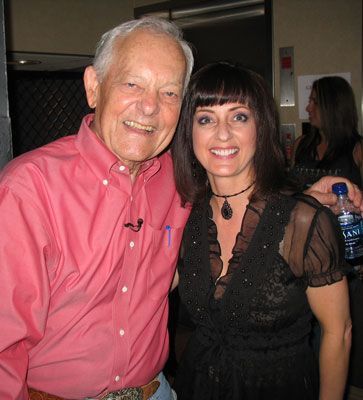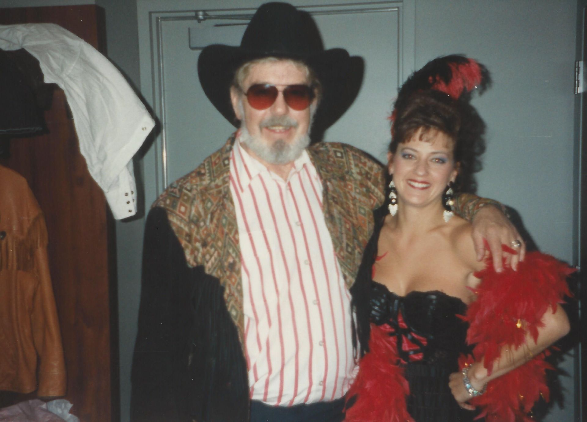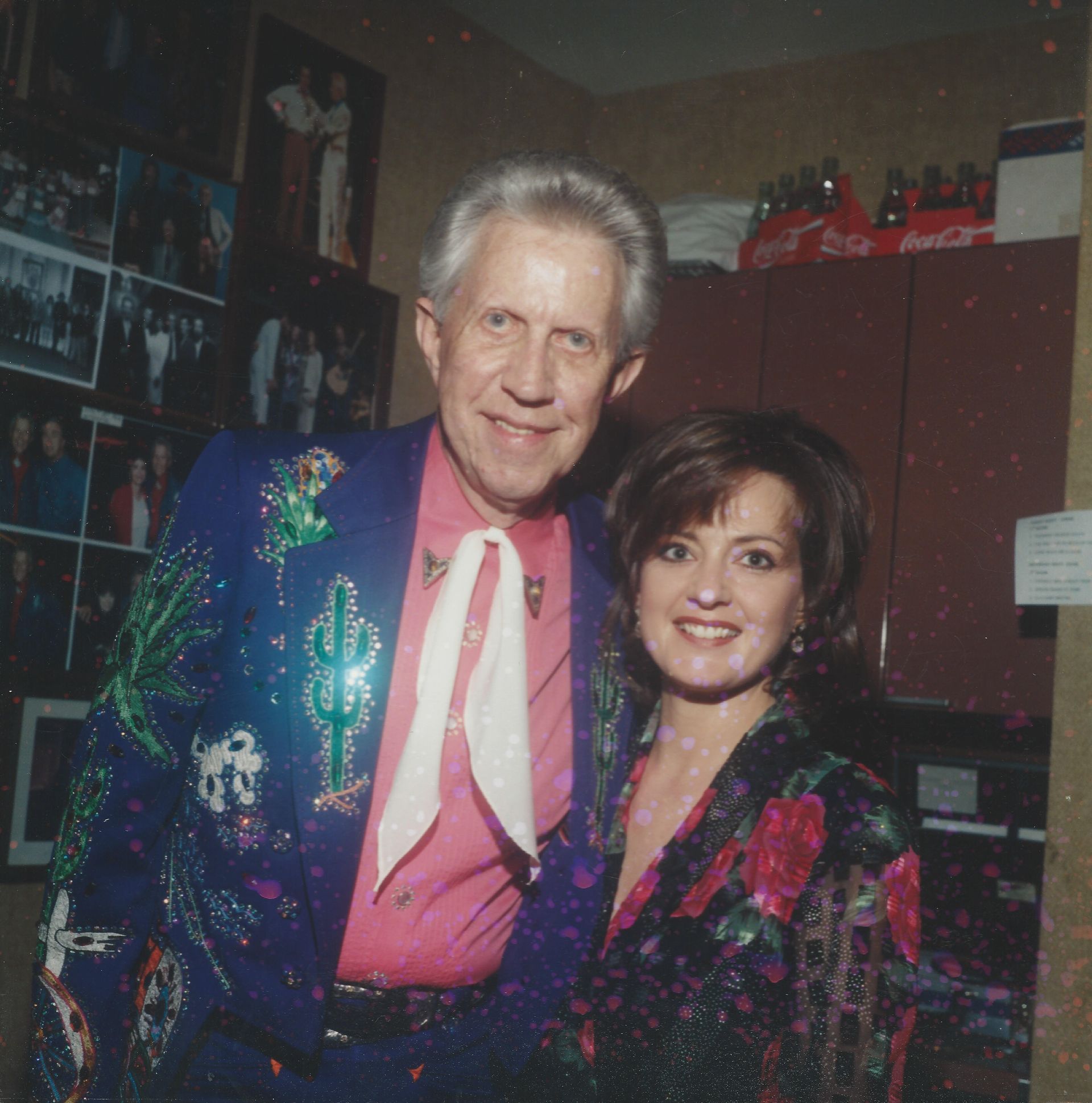 I have been fortunate to perform on the Grand Ole Opry many times. Both Lorrie Morgan and George Jones were members. When I wasn’t on tour, I would do recording sessions in many of Nashville’s studios. One of those studios was Sound Control in Berry Hill, TN not far from Music Row. Porter Wagoner would record there. I was fortunate to sing on Porter’s 2000 release “The Best I’ve Ever Been” album. I stopped by his dressing room at the Opry one night and we took this picture. I had been in a car accident earlier that day and my arm was swollen and I had a few bruises. It would take a lot more that that for me to miss the Opry. All those little spots on the picture is the light reflecting off all of the rhinestones on his Nudie Suit.