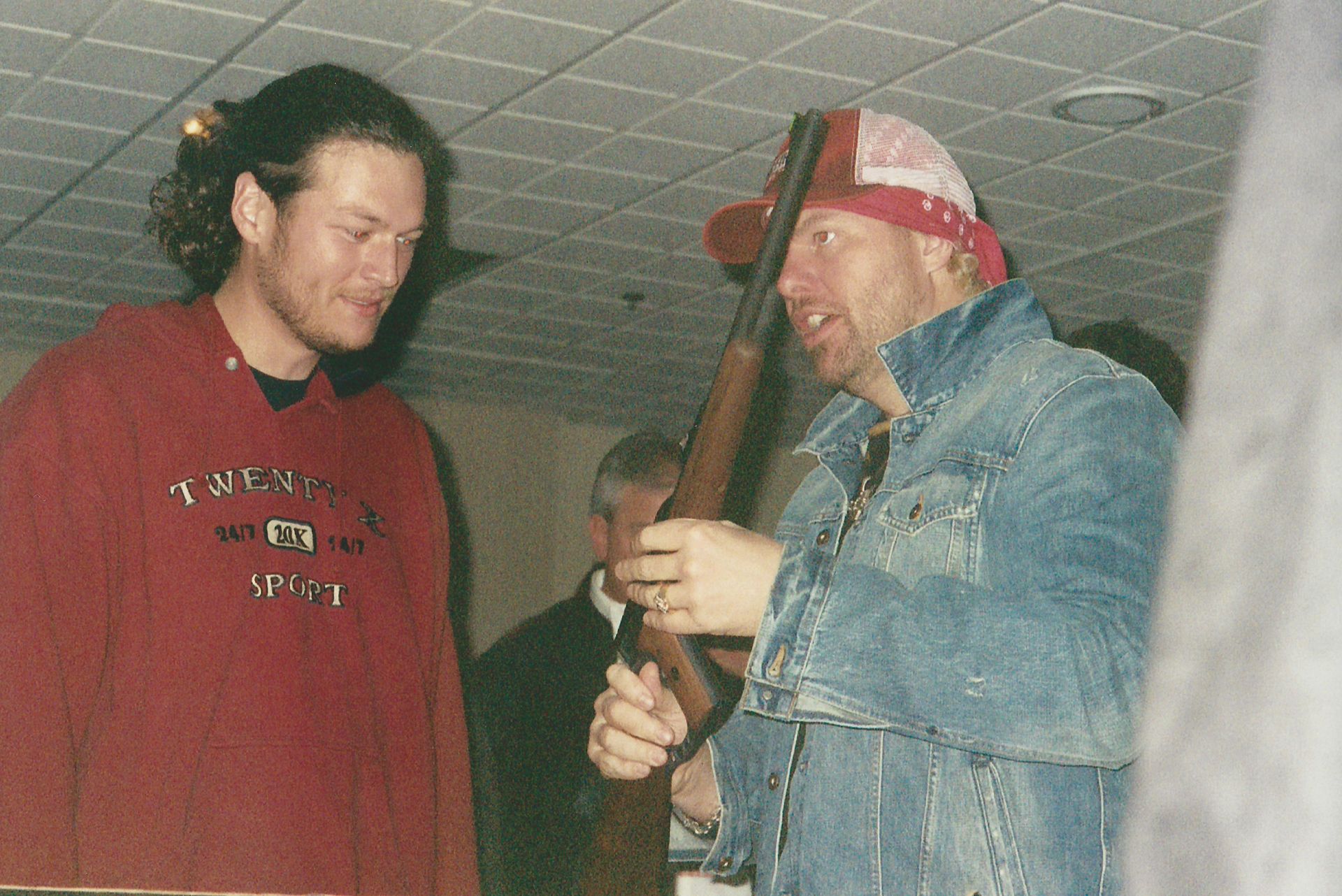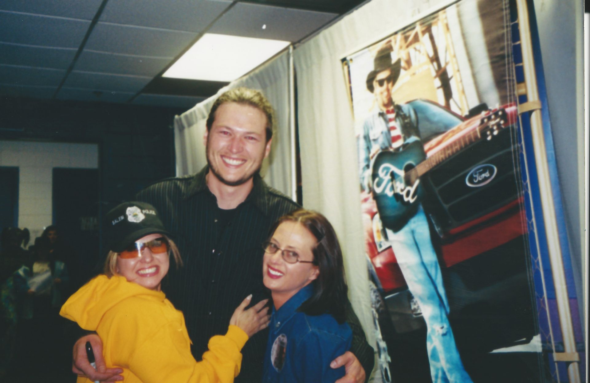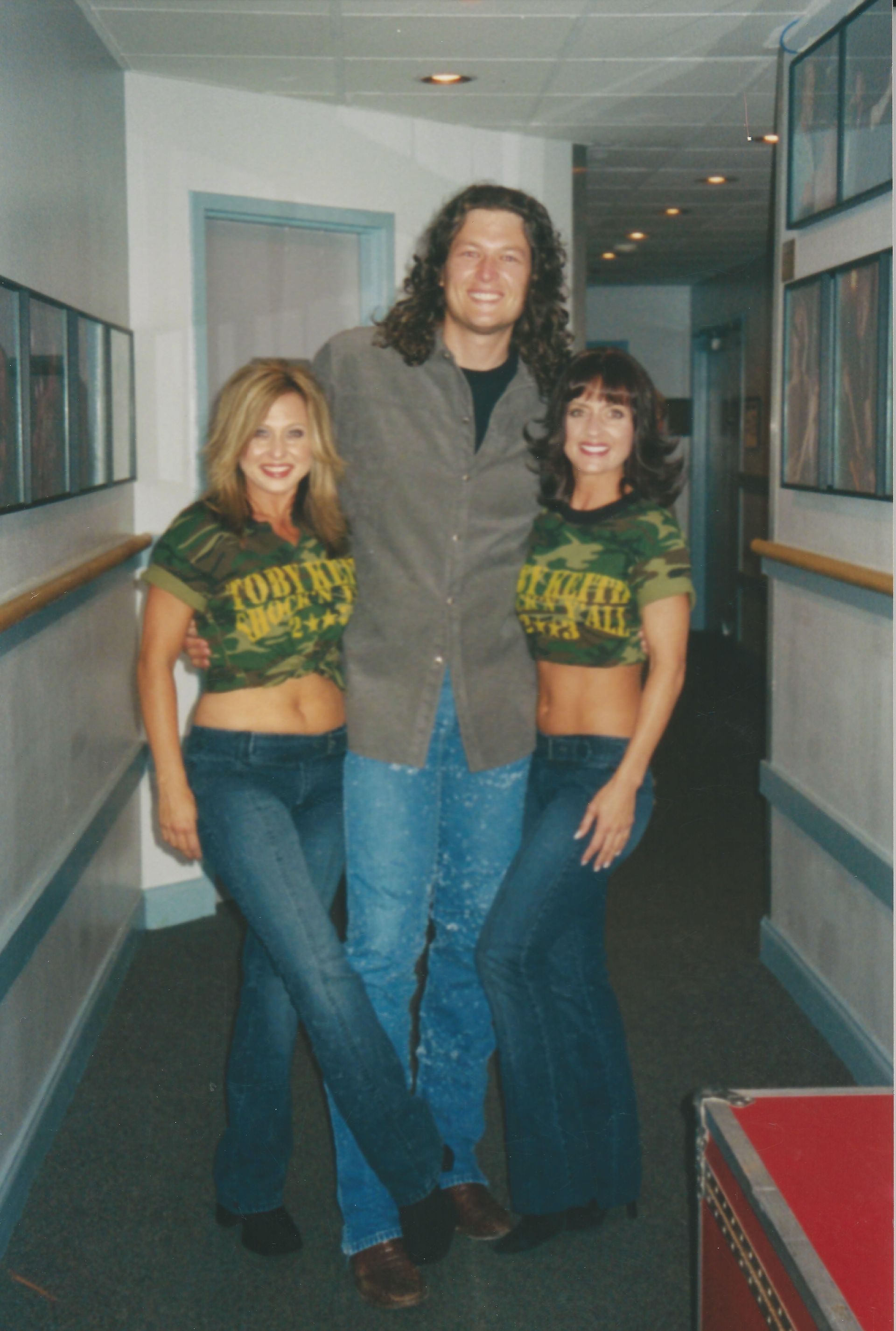 In 2003 and 2004 I toured as a background vocalist with Toby Keith for his Shock’n Y’all Tour. Blake Shelton was the opening act for much of the tour and had had a few hits but was struggling at Warner Brothers records. I felt he was an incredible entertainer and singer and am so glad to see him having the success and recognition he deserves. At that time, Blake wore Wrangler jeans on stage but before he wore them he would hang them on his wash line out in the country where he lived in TN and shoot at them with his shotgun. The buckshot would leave marks on them and give them a unique distressed look. Lauren Simmons and I went shopping one day to buy jeans to wear on stage and asked Blake to take them home and give them the “Shelton Shot” treatment. I still laugh knowing we bought Armani jeans $$$ for Blake to take home and shoot at. Here we are backstage with Blake modeling our “Shelton Shot Jeans”. I still have mine.