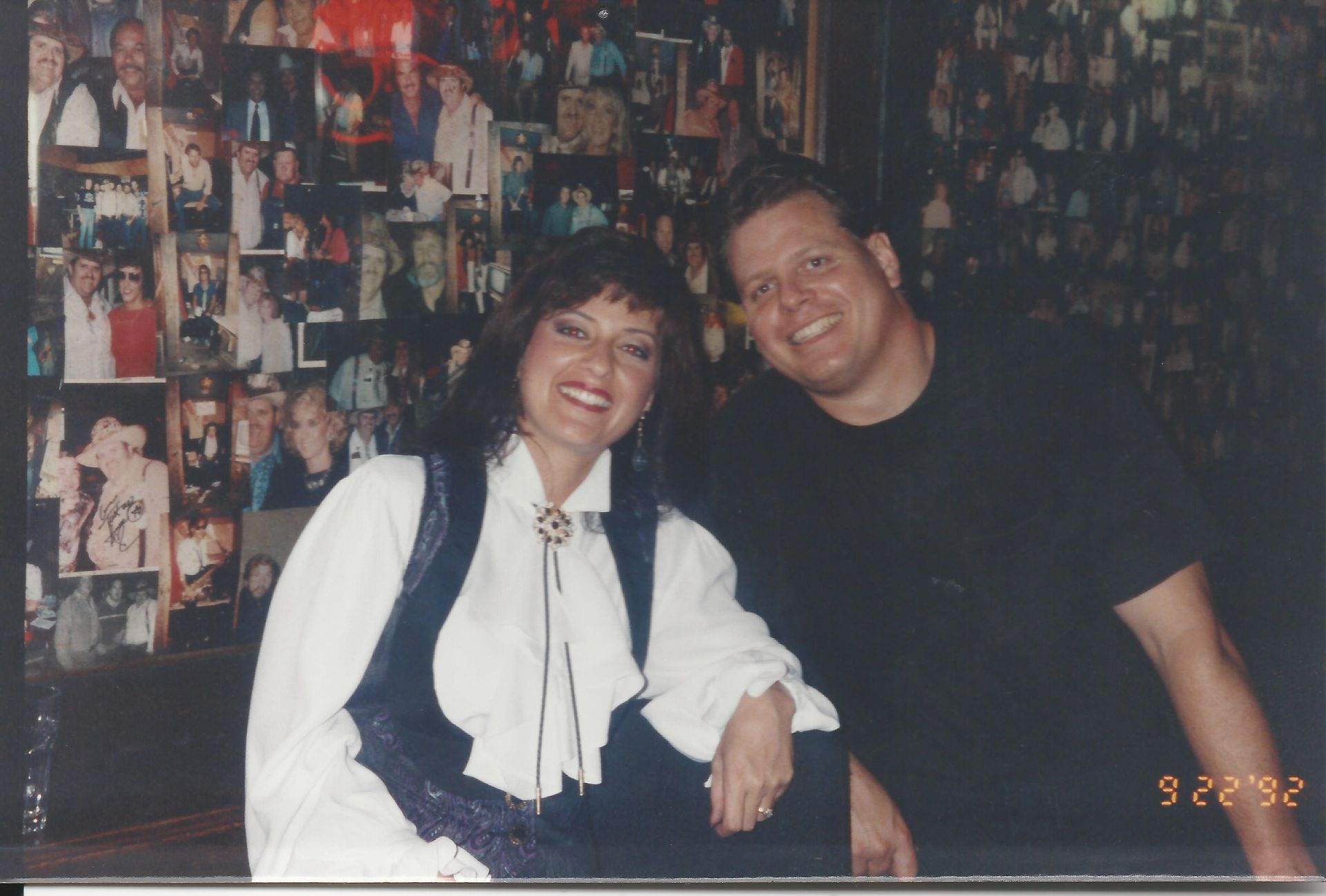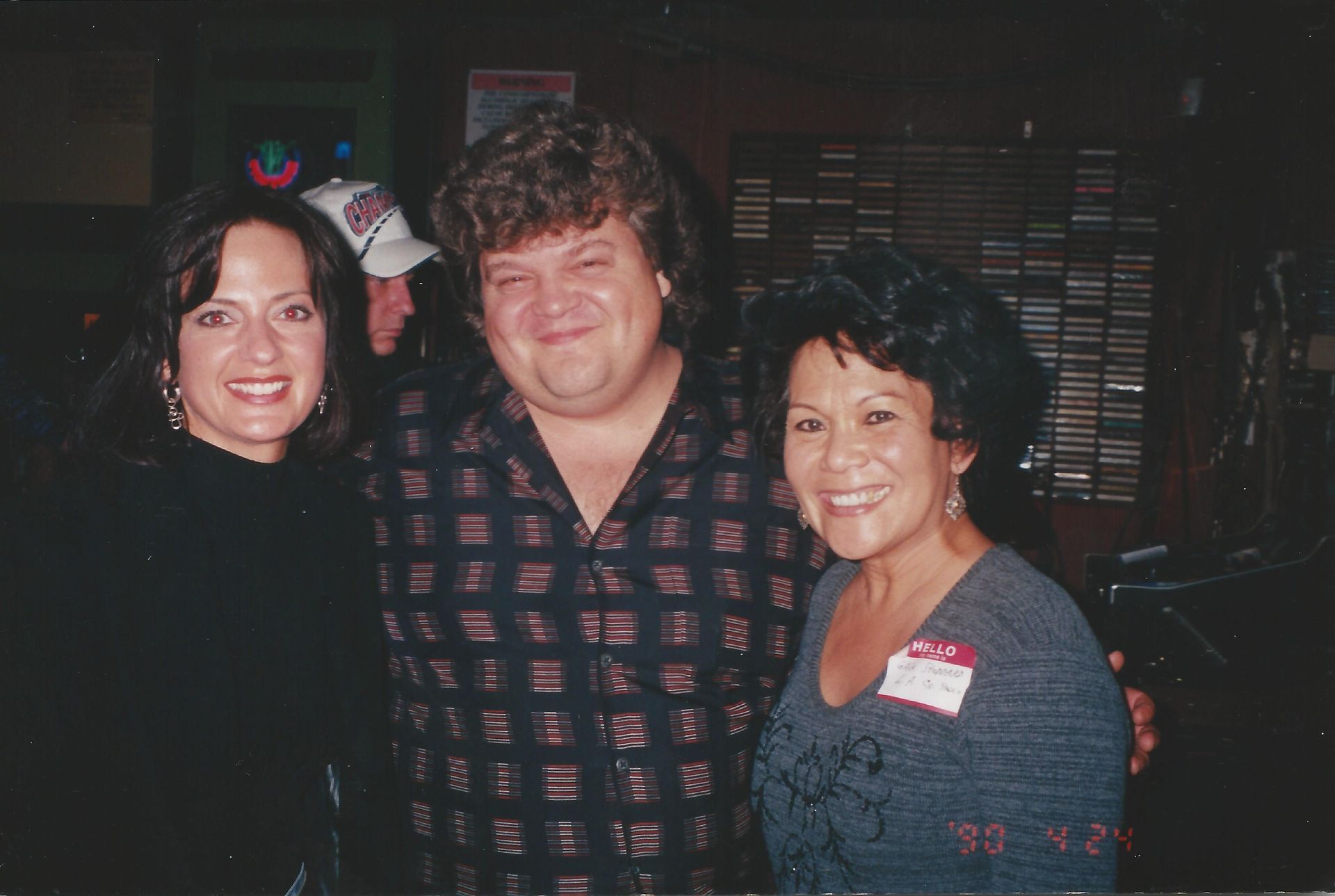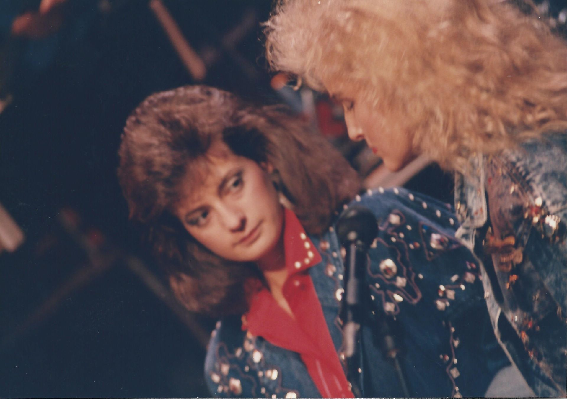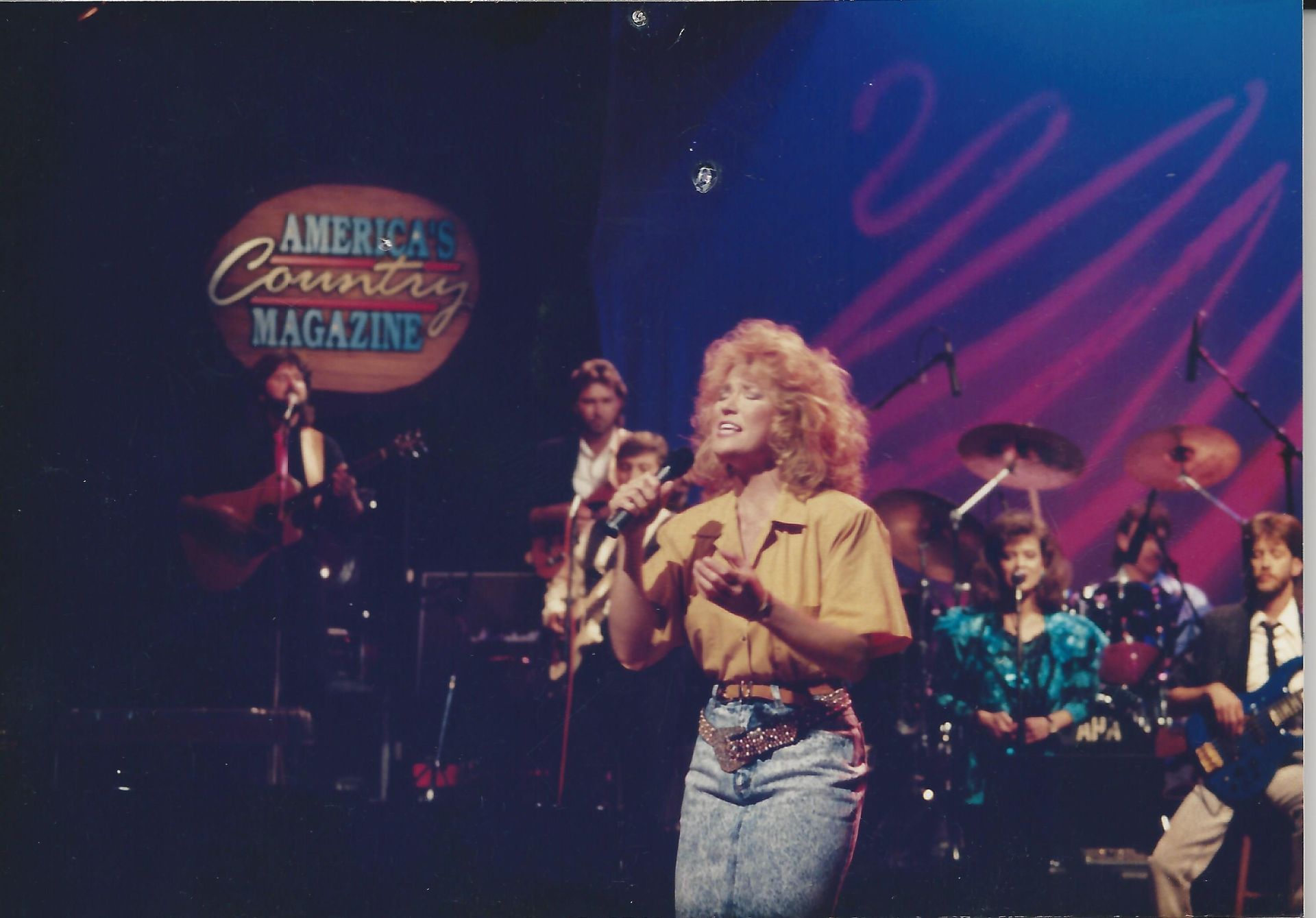 Prior to moving to Nashville in 1989, a friend of mine, Steve Swenson known in the Midwest for his band Cocktail Stevie and the Table Rockers (who I worked with briefly) told me that he was friends with Mickey Gilley’s bass player, Doug Driesel. Doug had told him Mickey was looking for a background vocalist. They put me in touch with Vicki Brower (Phillips) his other backup singer. We met and things were moving forward but at the last minute, Mickey hired Beverly Randall (married to Bobby Randall of Sawyer Brown fame) who had been in his band before. I was disappointed, but in the end, I’m sure it was best. In 1990 Vicki and Doug were asked to host America’s Country Magazine – a TV show for broadcast networks that featured interviews and live performances by country artists. We filmed a pilot and later a full season. Vicki asked myself and Angela Howell (the singer who had left Mickey Gilley when they were considering me to replace her) to be background vocalists in the studio band. It was one of the most fun times I can recall. The cast was a great group of talented musicians all such good people and all with a great sense of humor. The show featured many of legendary artists as well as up and coming. Here I am singing with Tanya Tucker, an amazing entertainer with an unmistakable voice.