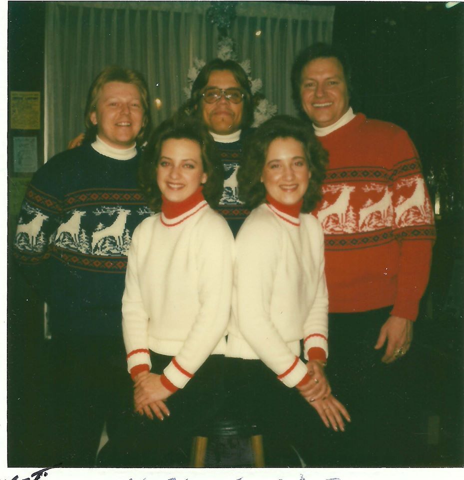 In the early 80's, my sister Pam and I were part of the Sherwin Linton show. During the holiday season, Sherwin would put together a Christmas dinner show at the Guest House in Watertown, SD. I have always loved Christmas music so it was something I really enjoyed. This photo was taken in front of the tree in the Guest House lobby. L to R in the back row, Ben Jenkins (bass guitar), Milt Lang (drums) and Sherwin Linton (lead guitar and vocals). Front row L to R, myself and my sister Pam. Later when I went on to work with Lorrie Morgan I did Christmas tours with her as well. It always felt magical to share this music and to entertain people at Christmas time.
