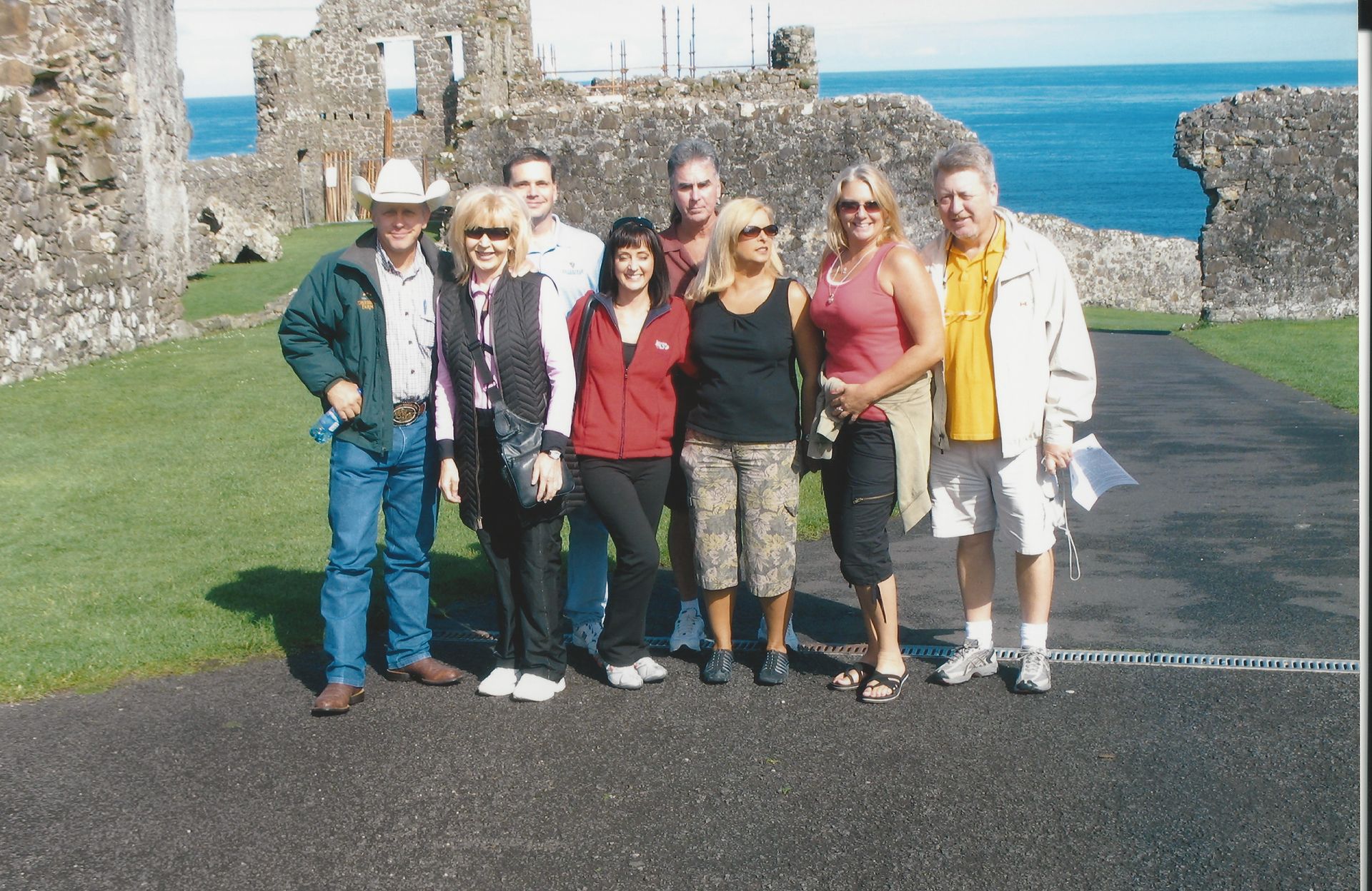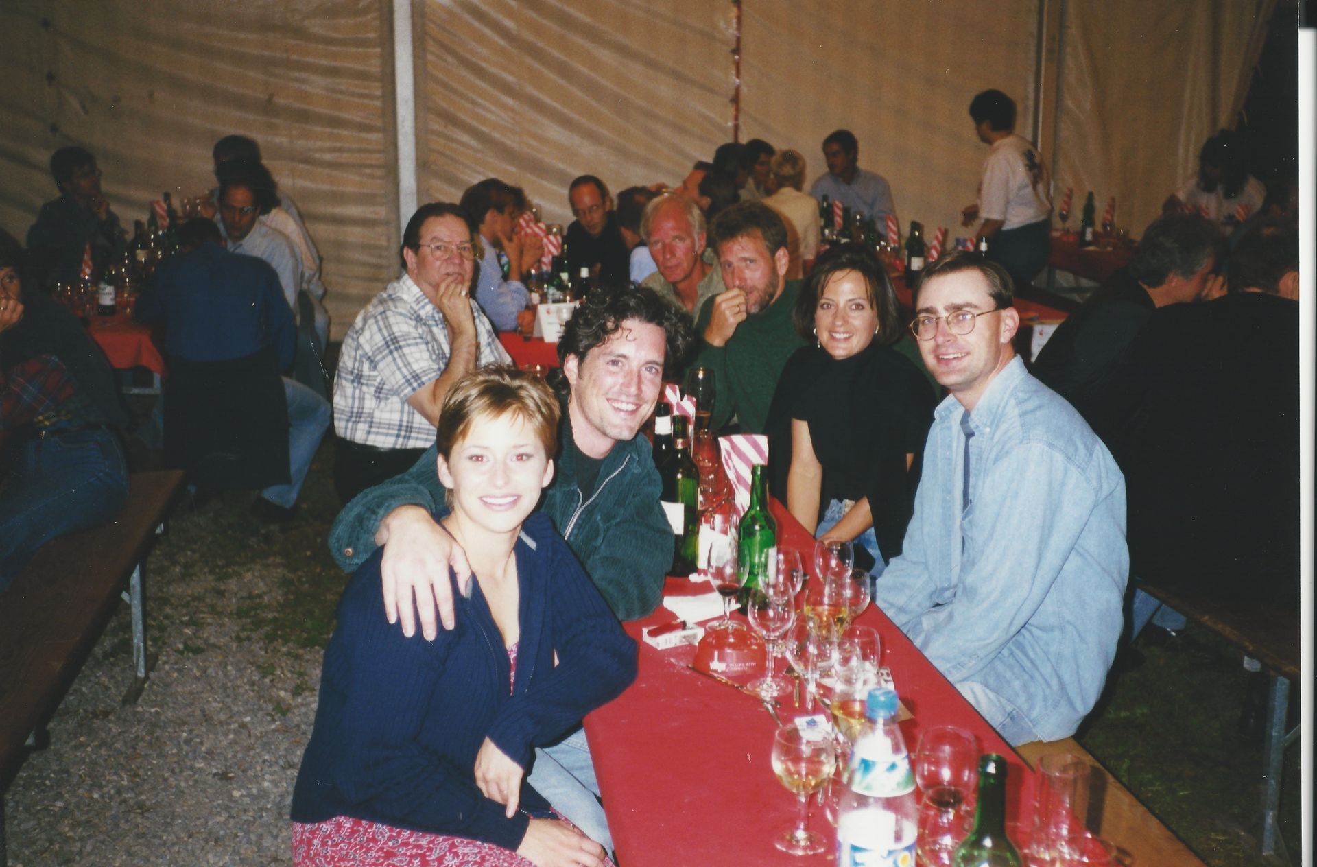 The night before the festival in Gstaad (1999), they had a welcome party for all the artists, their bands and crews, as well as sponsors for the event. It was quite an event - held in the huge tent where they would have the parties after the concerts each night of the festival. The other acts on the tour, were Mark Chesnutt, Ricky Skaggs, and Allison Moorer. I remember being so impressed by this party. The food was amazing and so was the wine. I noticed how good the "table wine" was and that the alcohol content was considerably lower than typical wine. I must have had 5 glasses that night, and still felt great the next morning. There was live country music and dancing after dinner. Just when I thought it couldn't get any better, big double doors opened on the other side of the tent and they pulled in this huge hay wagon full of every imaginable chocolate dessert. I kept thinking to myself, "How did I get here?" How did I get so lucky?" In this picture, on the left side of the table, Morgan Whitley (Lorrie’s daughter - in front), Randy Flowers (guitar - behind her). On the right side of the table, Dave Carney (guitar tech - in front), me, Mark Oliverius (keyboards), and Kyle Tullis (bass guitar).
