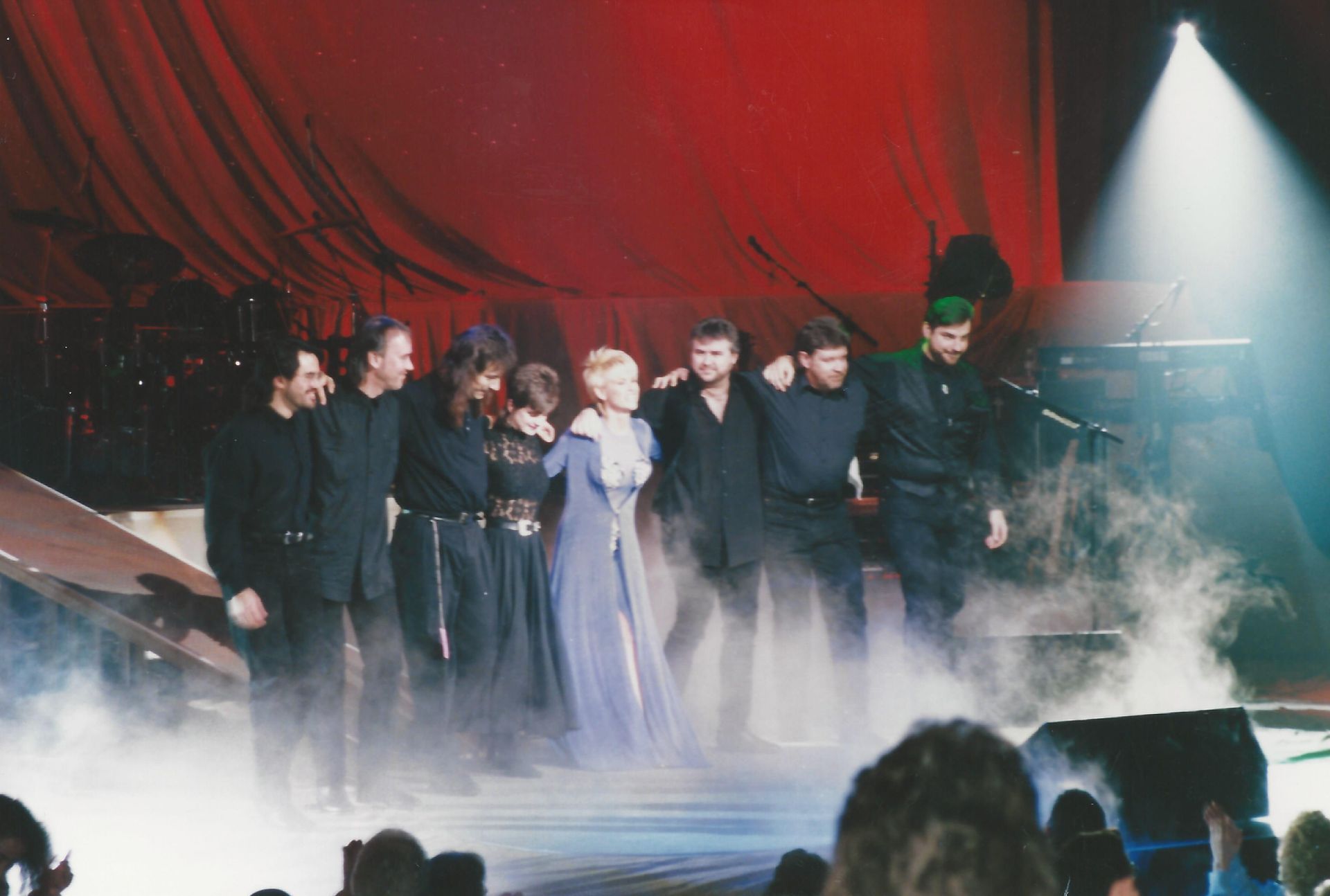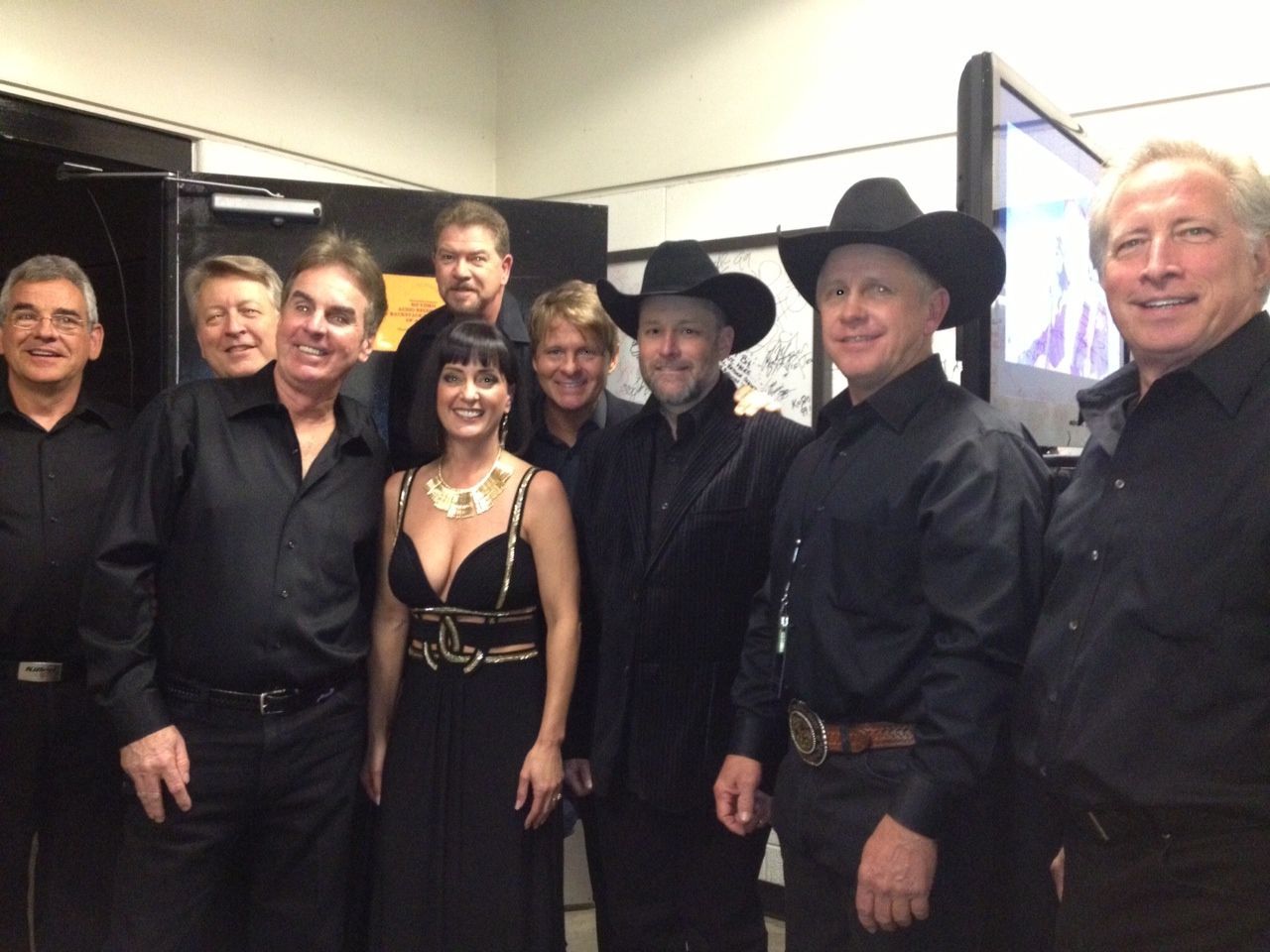 Lorrie Morgan released her War Paint CD in 1994. Many of our live shows were at Native American casinos. Lorrie had a full-fledged headdress that she would use as a prop and ultimately wear on stage during the song. It was met with resistance in some situations, but overall people understood it as a metaphor for the woman in the song putting on her makeup and going out to seek revenge on the man who’d done her wrong. This tour, to my knowledge was the first where Lorrie hired a producer for the show. Kenny Ortega produced the show and several after. This shot was from the final “rock-n-roll” bow at the end of the show. L to R, Rob Brownfield (acoustic guitar and fiddle), David Wood (steel, electric and classical guitars), Rocky Lindsley (drums), myself, Lorrie Morgan, Noel Roy (lead guitar), Spud Cottingham (keyboards), Pat Lassiter (bass).
