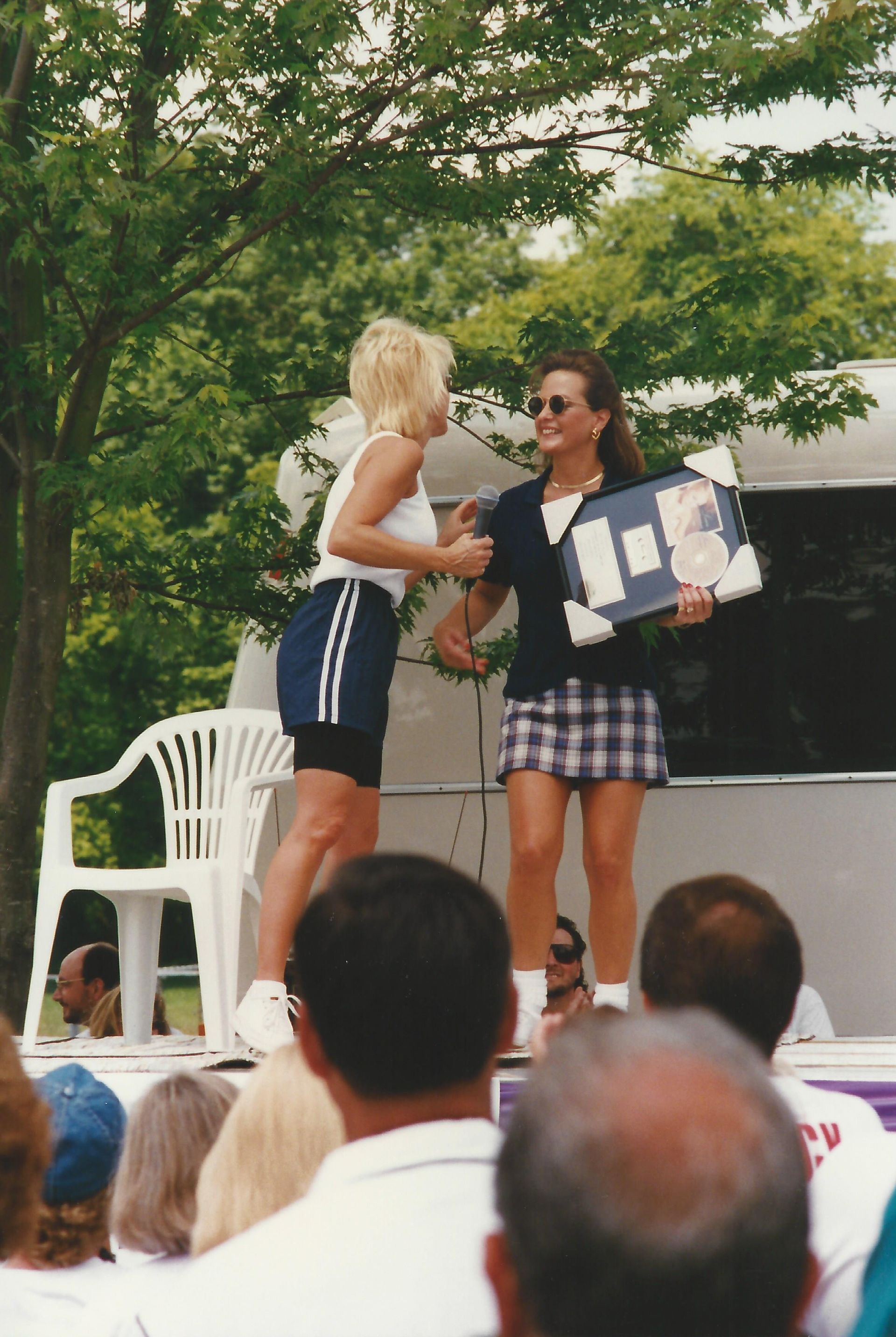 Each June, during Fan Fair (now CMA Fest), Lorrie would have a party for her fan club. I believe this photo was taken in 1997. She had her fan club party at a park in Hendersonville, TN near her home. Lorrie was presenting me with the gold award for her fifth studio album, Greater Need. It was released in June of 1996, so I think this was the fan club party in June of 1997.
