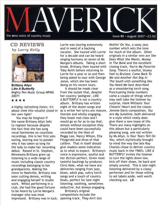 I had just started doing promotion for my "Like a Butterfly" CD, and my producer, Chris Nole and I went to a meeting. To be honest, I don't remember what the meeting was for - possibly with a potential management company or publicist. As soon as we sat down in the office, the gentleman we were meeting with opened up a copy of Maverick Magazine ( a UK country music publication) and set it in front of us. Printed there, was a review for the CD. I had submitted the CD for review knowing they get countless CD submissions. I had no idea, that anyone had listened to it, let alone decide to review it. We played it cool and went on with our meeting which ultimately went nowhere. However, I don't know that I would have ever seen the review if not for that meeting. Once in the car, Chris asked me to read the review. I did, and started to cry when Larry Kelly started complimenting my songwriting. I have always sung, but writing is a craft I had to learn and develop with many amazing mentors in Nashville. It was so gratifying that someone I'd never met, "got it". He understood the CD, my music, just as we had intended it. One needs moments like these every now and then to keep up the pursuit.