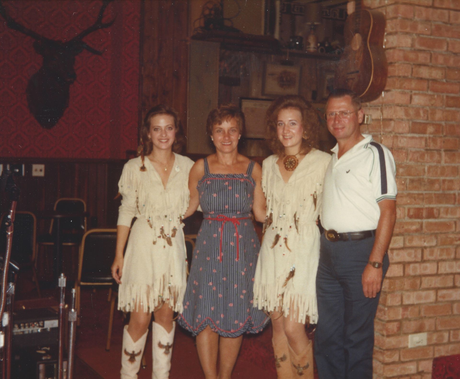 This picture was taken at The Guest House in Watertown, SD about 1983. My sister Pam and I were part of the Sherwin Linton show and The Guest House was a hotel with a large multi-level lounge. Sherwin would perform there for weeks at a time and as a result, Pam and I made many lifelong friends. We're pictured here with our mom (Nettie) and dad (Tom). They would come out to Watertown on weekends sometimes to see the show and of course check up on Pam and I. There was a pretty nice western store on the edge of town that Pam and I would frequent looking for potential stage clothes. We bought these outfits there. I wondered if they had ordered them with us in mind as I can't imagine the locals wearing anything like this. This will always be one of my favorite stage outfits. Mom and dad look so young in this picture. I know they must have worried about us a lot. Pam and I were young, but thanks to their parenting, quite responsible - in many cases far more than the other much older band members we worked with.
