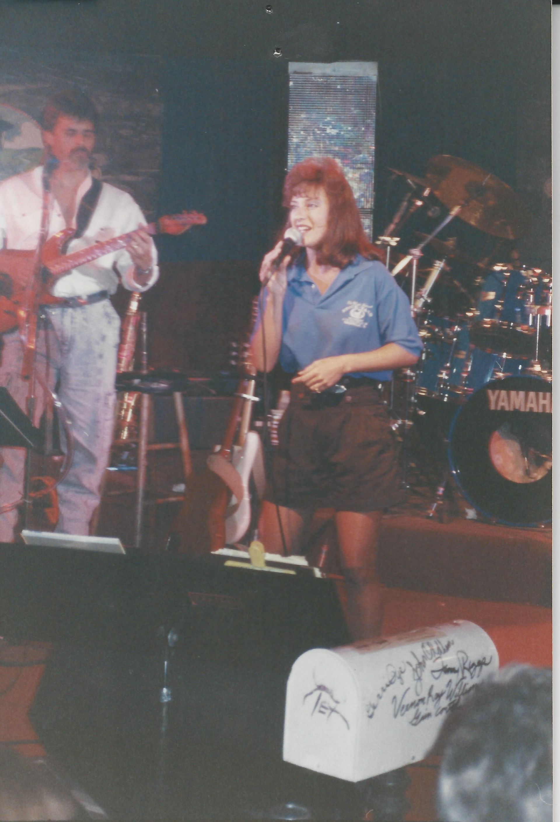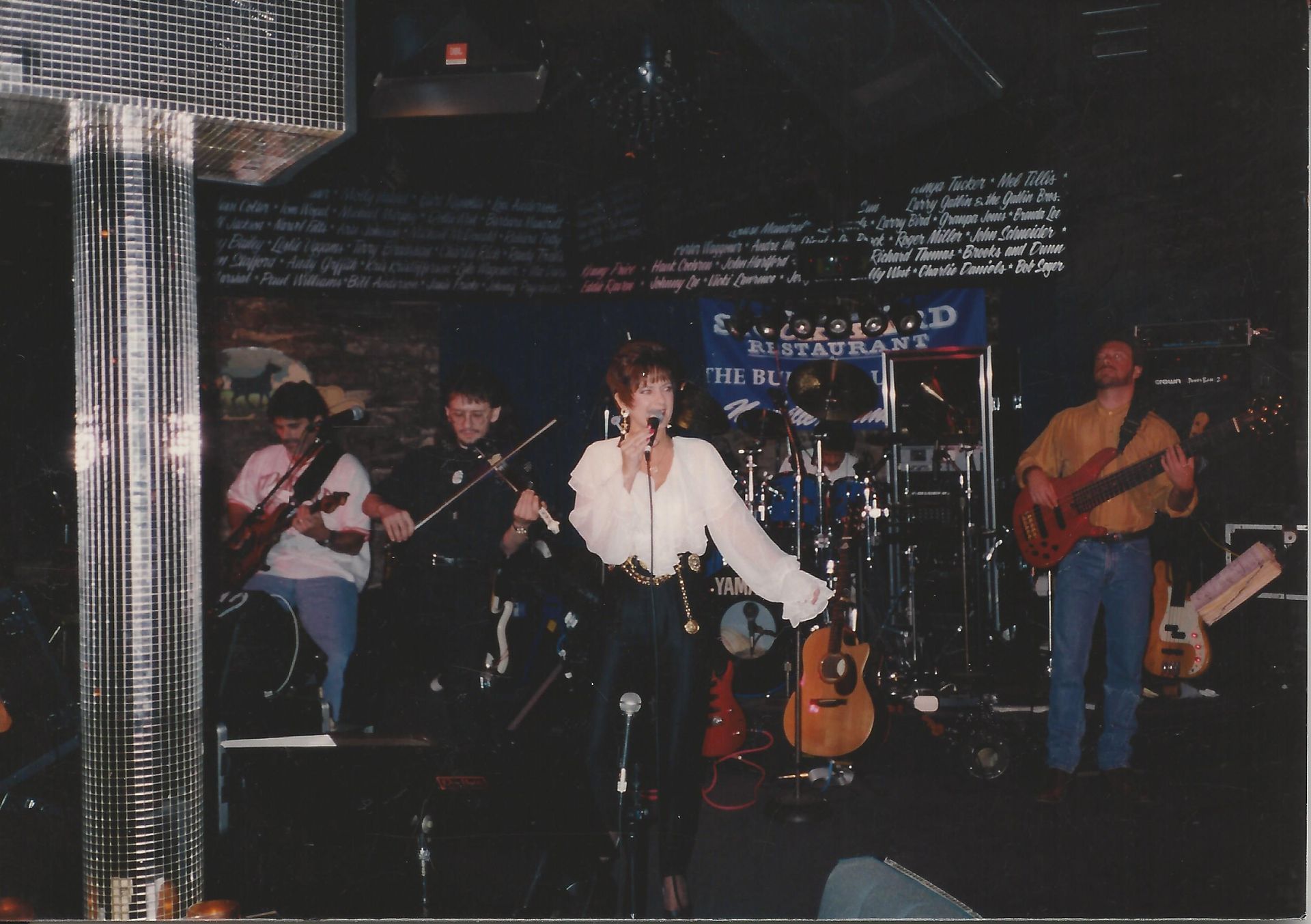 It was at the Stock-Yard that I found out that Lorrie Morgan was looking for a background vocalist. Her tour manager, Mike Chamberlain hunted on Hank Salyer's (guitar player in the house band) land. He gave me Mike's number, I managed to get an audition, and the rest is history. When I started with Lorrie I gave up my waitressing, but sang at the Stock-Yard when I wasn't on tour. Buddy Killen, the owner knew the music business well, understood and was very supportive. Eventually, it became too much working at the Stock-Yard and touring. I quit the Stock-Yard but it wasn't an easy thing to do. There were a lot of special people there and performing there was awesome! Pictured here on stage in the Bullpen Lounge with Larry Franklin on fiddle and Dow Tomlin on bass guitar.