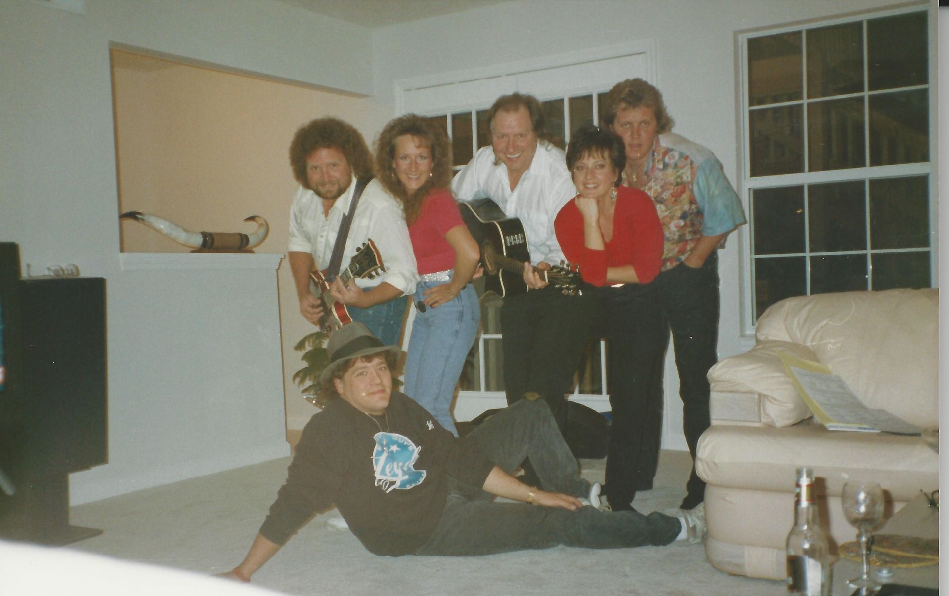 My husband Buddy (Lee), Sherwin Linton's son and I moved to Nashville in 1989. I had quite Sherwin's band a few years earlier to work with Southwind. It was all part of our plan as we prepared to make the move. In 1993 we had built our first home. Both Dwight Martin and Steve Gwinn had moved to Nashville and were pursuing the business as well though we all were sort of going our own directions. Sherwin and Pam were in town recording so I decided to have everyone over for dinner. Sherwin thought it would be fun to recreate the picture we'd taken years earlier. From L to R, Dwight Martin, my sister Pam, Sherwin, myself, my husband Buddy (standing in for Curt Henry, and Steve Gwinn on the floor.