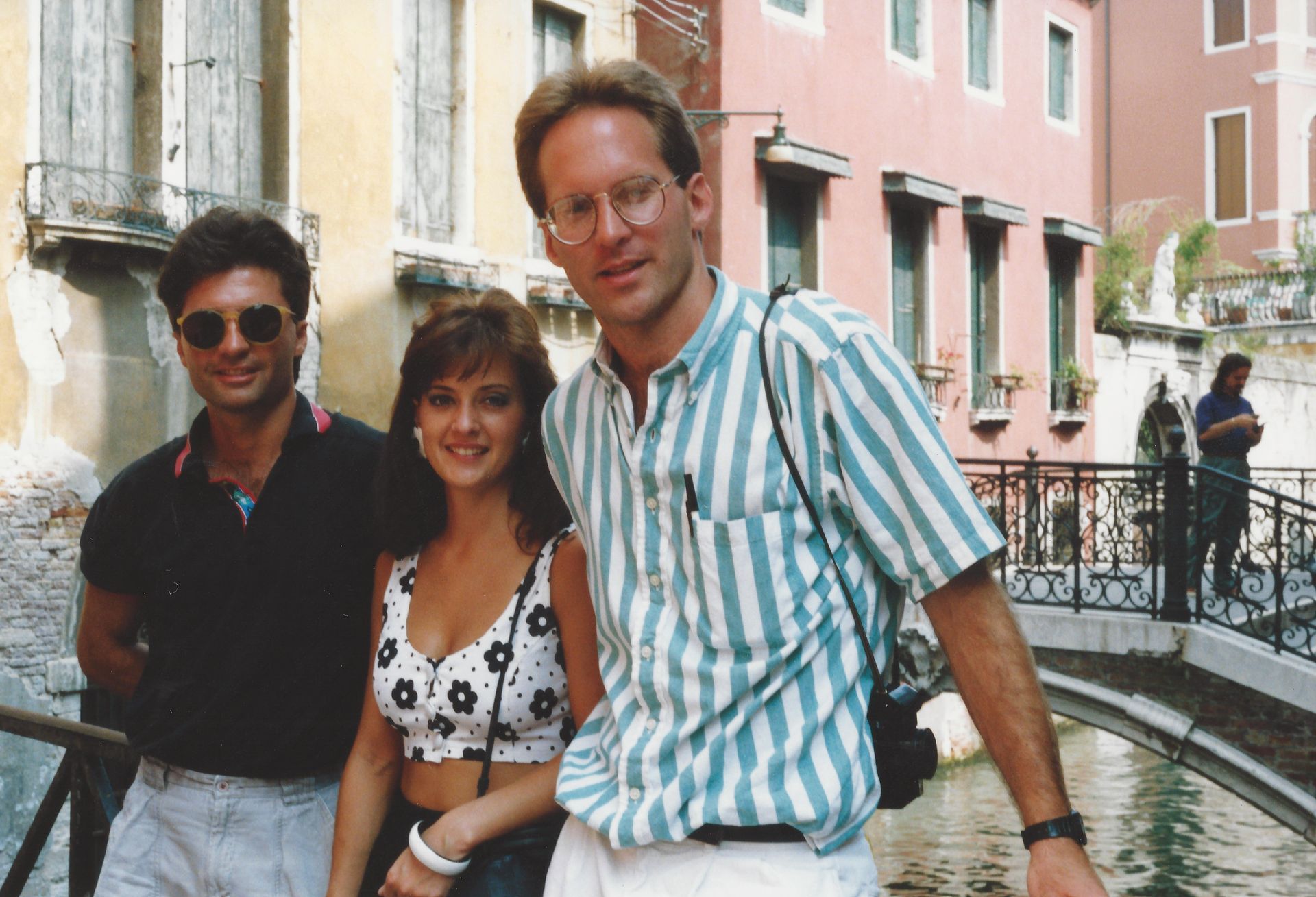 In 1991, I did a tour for the Dept. of Defense as part of a show band called "Flight". Maury Kelley was bandleader and his brother Michael was also in the group. We performed at a military resort in Berchtesgaden, Germany. It was the first time I had ever traveled overseas, and I took every opportunity to see as much as time would allow. The group took a day trip to Venice, Italy. Here I’m pictured on one of the bridges with Maury Kelley (L) and Michael Kelley (R).