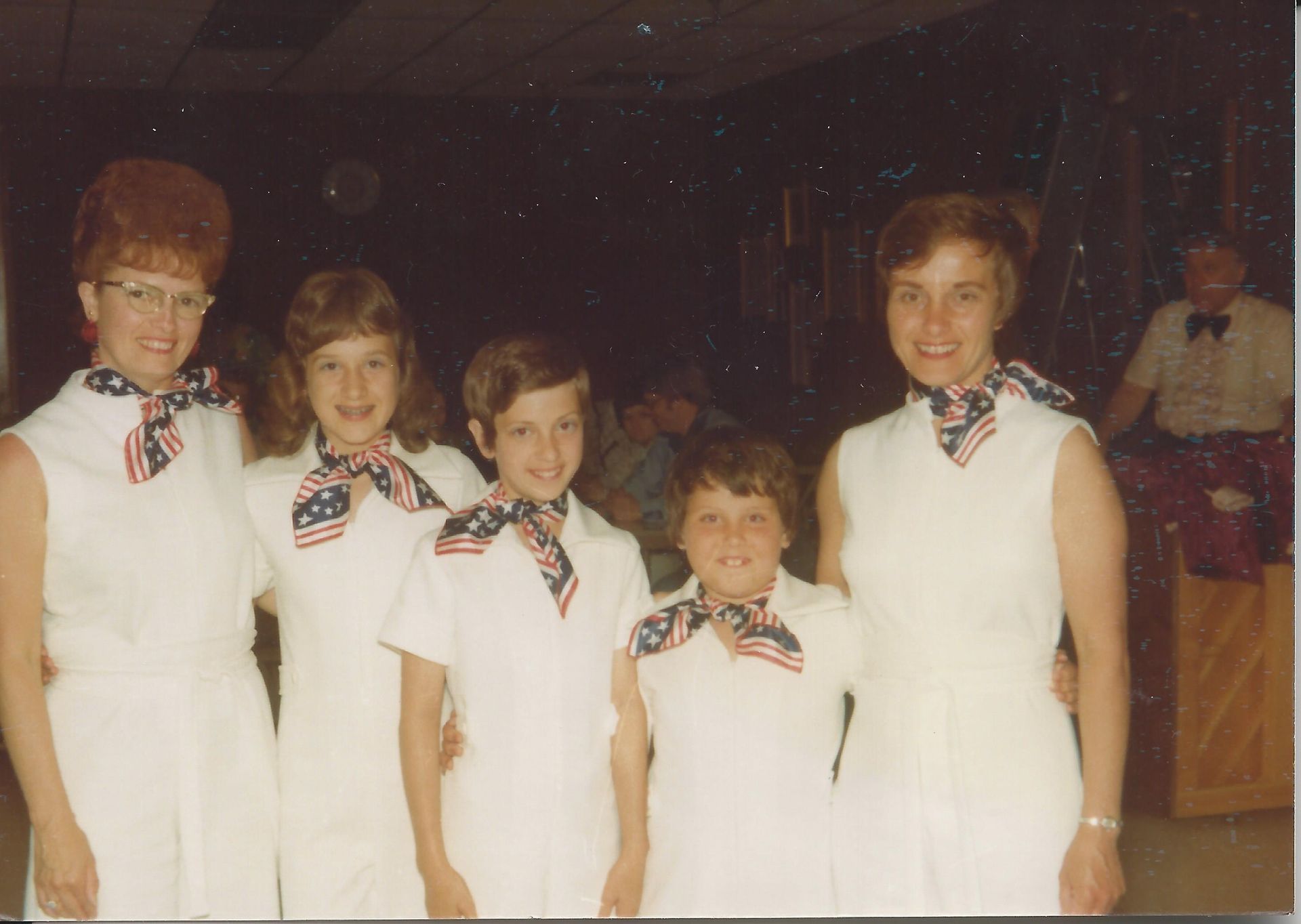 1976 was a big year for me. I had been singing on Sunday afternoons at a local supper club, had entered a talent contest at the MN state fair where I was a top finalist (lost to some jugglers), and the "Trobec Sisters" were getting the most work we'd ever had. Everybody was celebrating and there were all sorts of special events and celebrations. My aunt Betty who accompanied us on piano also sewed our stage costumes. She made these white jumpsuits for us girls and for her and mom as well. We added the scarves for that "bicentennial" touch. This picture was taken at a MN School Bus Operators convention. Our dad and grandpa were in the bus business and members of the organization- wonder how we got that gig??? I remember performing at a celebration in Albertville, MN. The people that hired us were surprised when we showed up - they thought the Trobec Sisters were singing nuns! Oh well, not quite, at least we were Catholic. From L to R: Aunt Betty Trobec, Pam, myself, Peggy, and our Mom, Nettie.